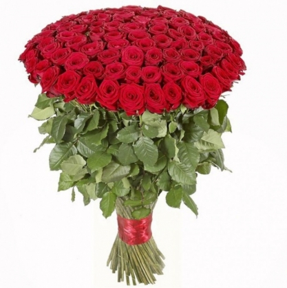 Потрясающий букет из 101 высокой розы под ленту. Розы этого сорта имеют красивый запах и качественную широкую листву.